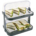 Transparente Rolltophauben (SAN Kunststoff) sind beidseitig aufklappbar und schützen ihre Speisen, Schale (ABS Kunststoff), Tablett 39x28 cm (Edelstahl 18/0), Kühl-Akkus (halten ihre Speisen bis zu 6 Stunden kühl). Buffet-Vitrine ist zerlegbar, daher platzsparende Aufbewahrung. Leicht zu reinigen, da alle Einzelteile (bis auf die Akkus) spülmaschinengeeignet sind. Farbe: schwarz.