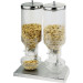 Edelstahl-Deckel. Fuß Zinkdruckguß verchromt. Kunststoffbehälter, herausnehmbar, bruchfestes Polycarbonat. Inhalt: 2x4,5 Liter. Portionieren durch einfaches Drehen.