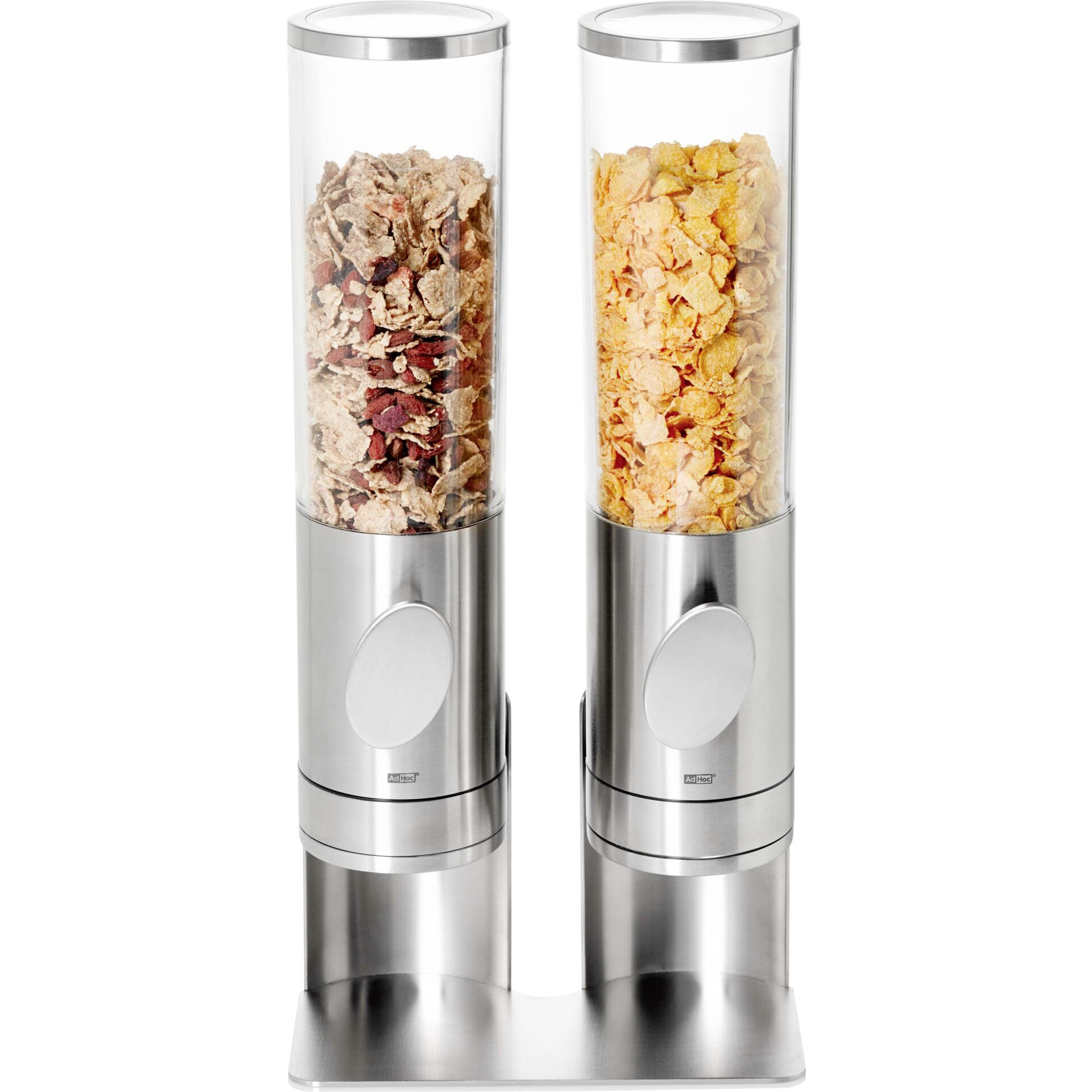 Edelstahl/Acryl. Mit Ständer. Volumen je ca. 1,5 Liter. Geeignet für Cerealien, Reis, Getreide, Süßigkeiten, Nüsse uvm. Zur Verwendung am Tisch ist der Spender abnehmbar. Krümelfreies, leichtes Portionieren. Aromaschutzkappe schützt die Lebensmittel und sorgt für eine saubere Arbeitsfläche. Einfache Reinigung.