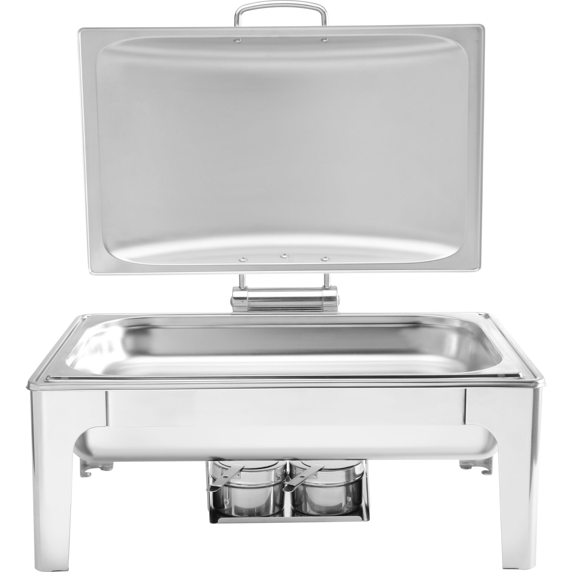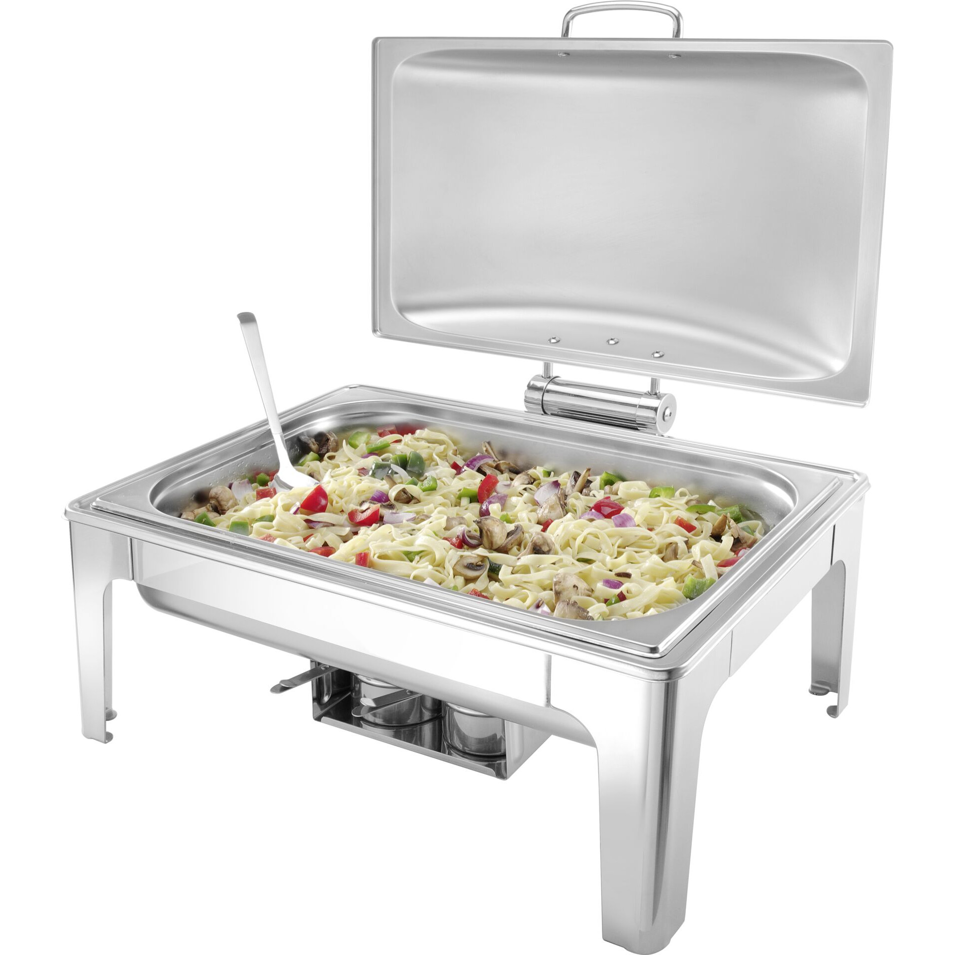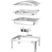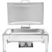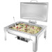 Ideal für den Einsatz am Buffet und im Catering. Satinierter Chafing Dish inkl. Zubehör aus langlebigem Edelstahl. Der Deckel ist mit einer Bremse ausgestattet; dadurch verbleibt dieser in der gewünschten Stellung und kann für eine einfache Reinigung auch abgenommen werden. Inkl. zwei Brennpastenbehälter, einem 1/1 GN-Einsatz 65 mm und einem herausnehmbaren Wasserbehälter.
