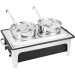 Rahmen Edelstahl 18/10 poliert, 2 Suppeneinsätze (je 4 Liter Inhalt) mit 2 Deckeln und 2 Suppenlöffel aus Edelstahl 18/10 - mit elektrischem Wasserbad 1/1 GN (Art.-Nr. 2562.H zum Austausch geeignet) aus Polypropylen - hitzebeständig, inkl. Deckelhalterung.