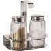 Höhe in cm: 10,5 Ausführung: 3-tlg. Glasbehälter mit Edelstahlkappe 18/0. Set bestehend aus Salz-, Pfefferstreuer und Menagengestell.