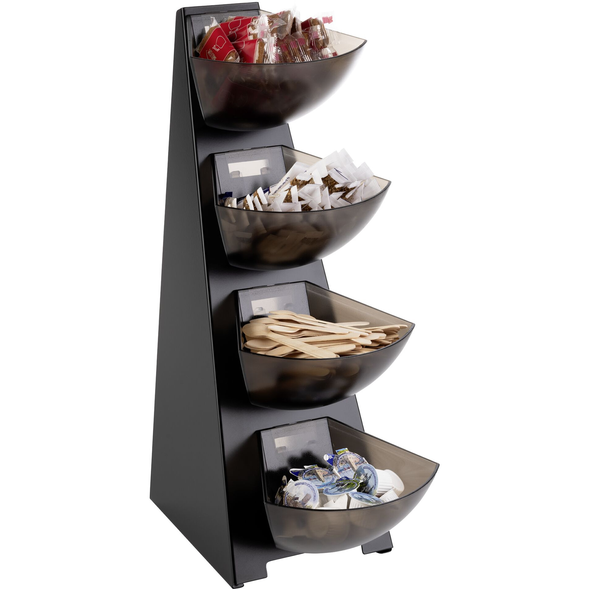 Multi-Rack zur Aufbewahrung von Gastrozubehör wie z.B. Kaffeemilch, Zuckersticks oder Besteckteilen. Gestell Edelstahl, schwarz, matt poliert. Schütten aus grau gefrostetem Kunststoff mit einem Fassungsvermögen von je ca. 1 Liter. Profiqualität. Made in Germany. Spülmaschinengeeignet!