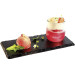 LxBxH in cm: 25x12x0,4-0,7 Naturschiefer. Mit einer Aussparung Ø 5,5 cm. Mit lebensmittelechtem Speziallack versiegelt. Fett- und wasserdichte Oberfläche.