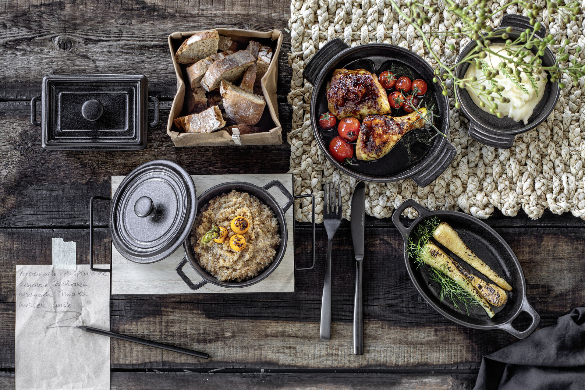 Porzellan. Optik wie Gusseisen. Farbe schwarz. Backofenfest bis 220°C. Spülmaschinengeeignet. Mischsortierung.