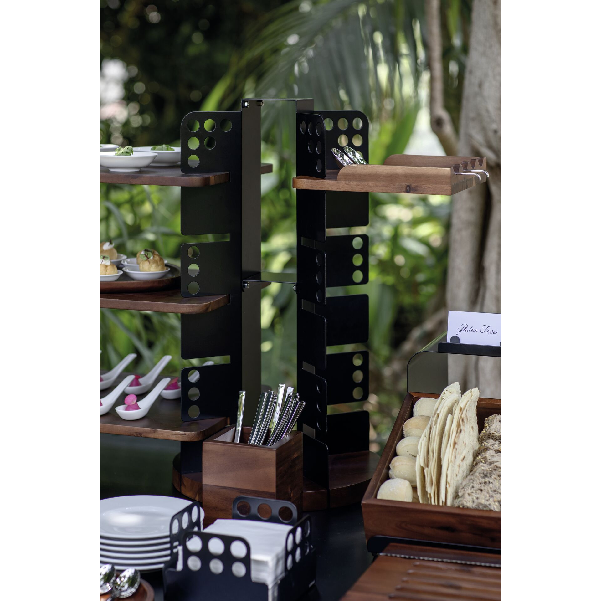 Edelstahl, schwarz beschichtet, Fuß Akazienholz, braun. Passend dazu Einlageböden 17092, 17093, 17094 u. 17095. ØxH in cm: 34x62