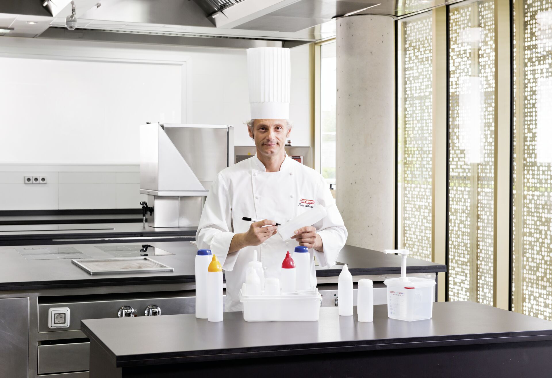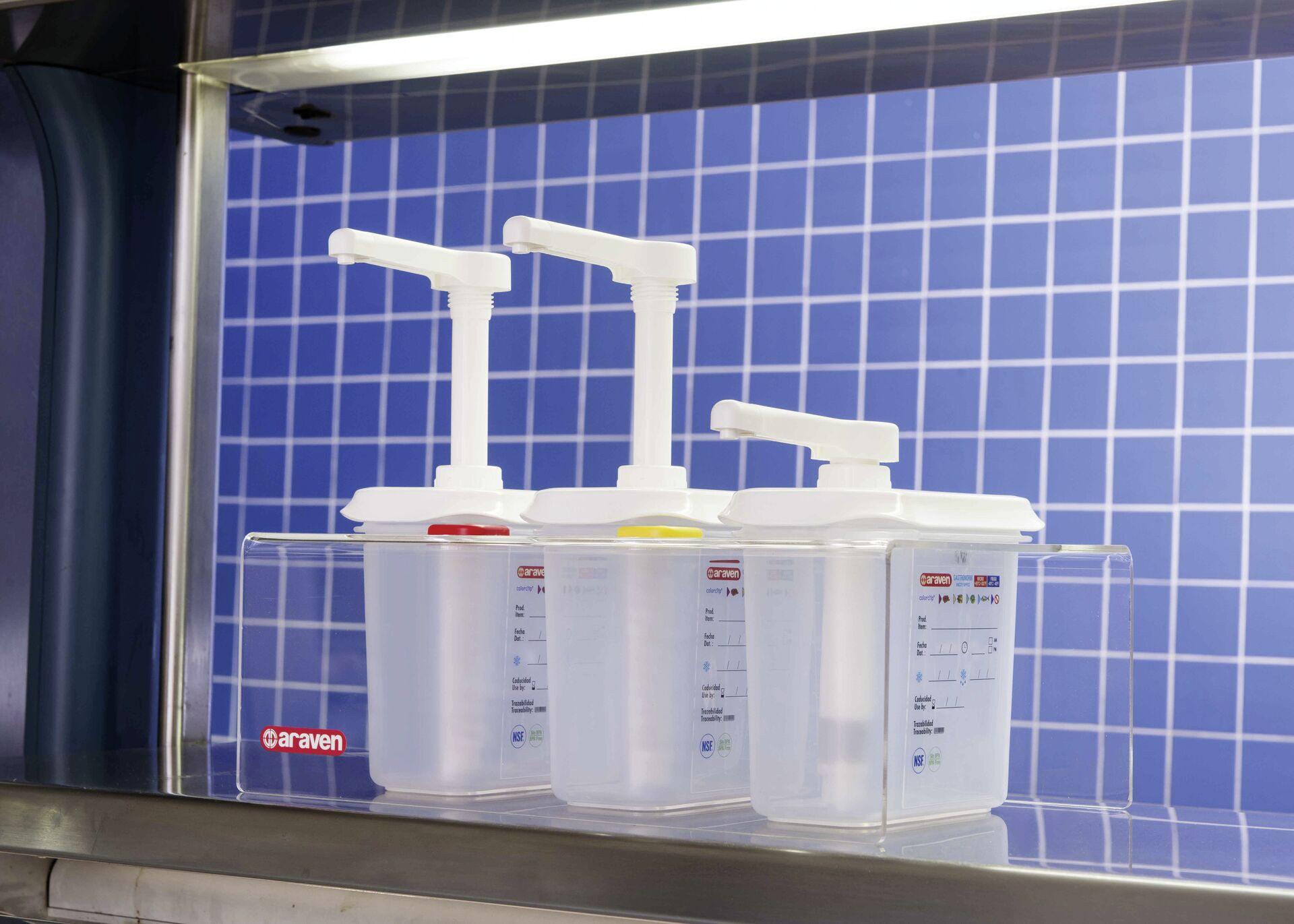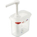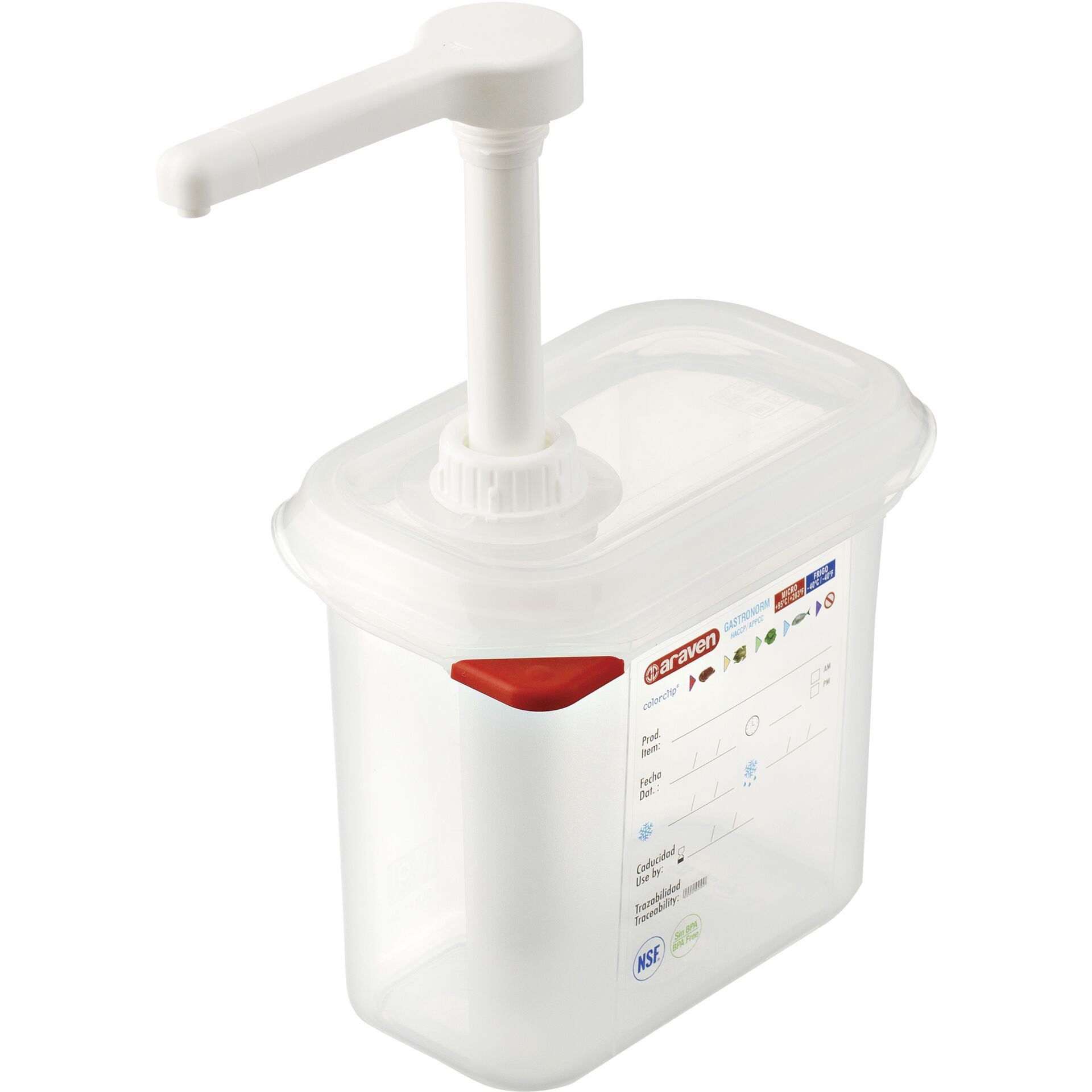 Polypropylen, transparent. Für Dressings, Soßen, Sirups, etc. Inkl. integrierter Skala, aufgedrucktes Etikett zum Beschriften mit Art.-Nr. 146700 (Stift schwarz), 4 farbliche Markierungsplättchen. Pumphahn ist platzsparend zu versenken.