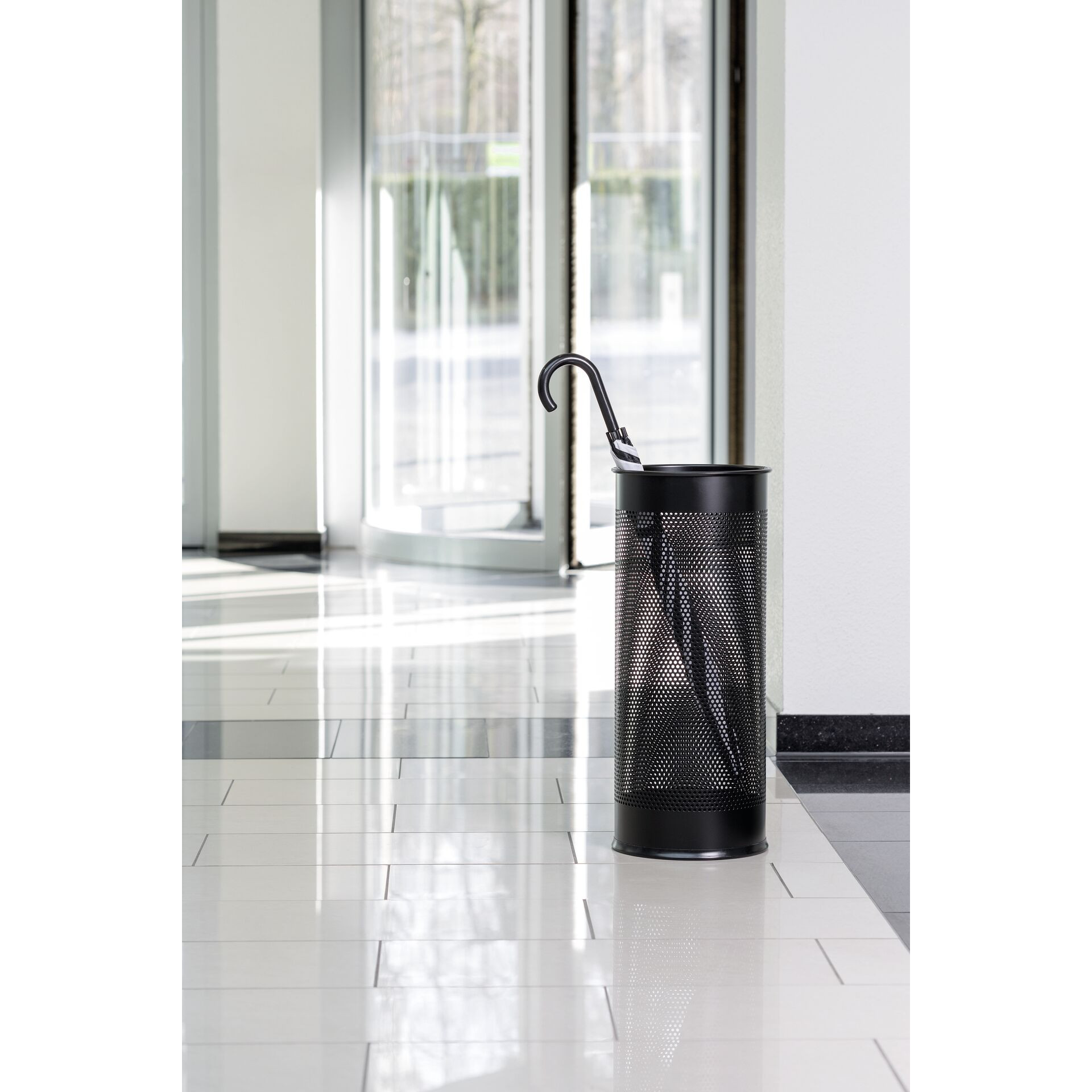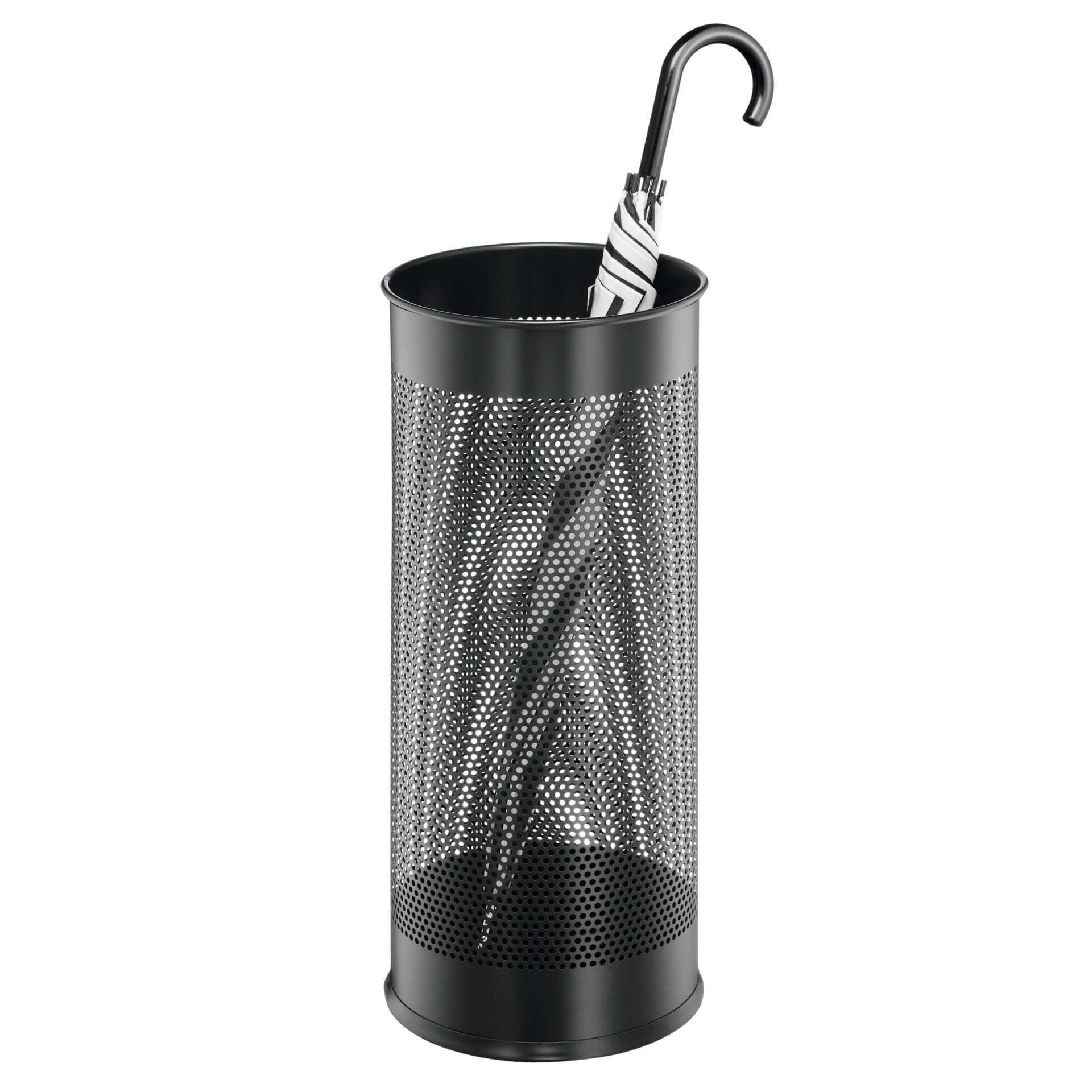 Schirmständer aus Metall. Lackiert und perforiert, mit schonendem Gummiring am Ständerboden. ØxH: 26x62cm. Inhalt: 28,5L Farbe: schwarz