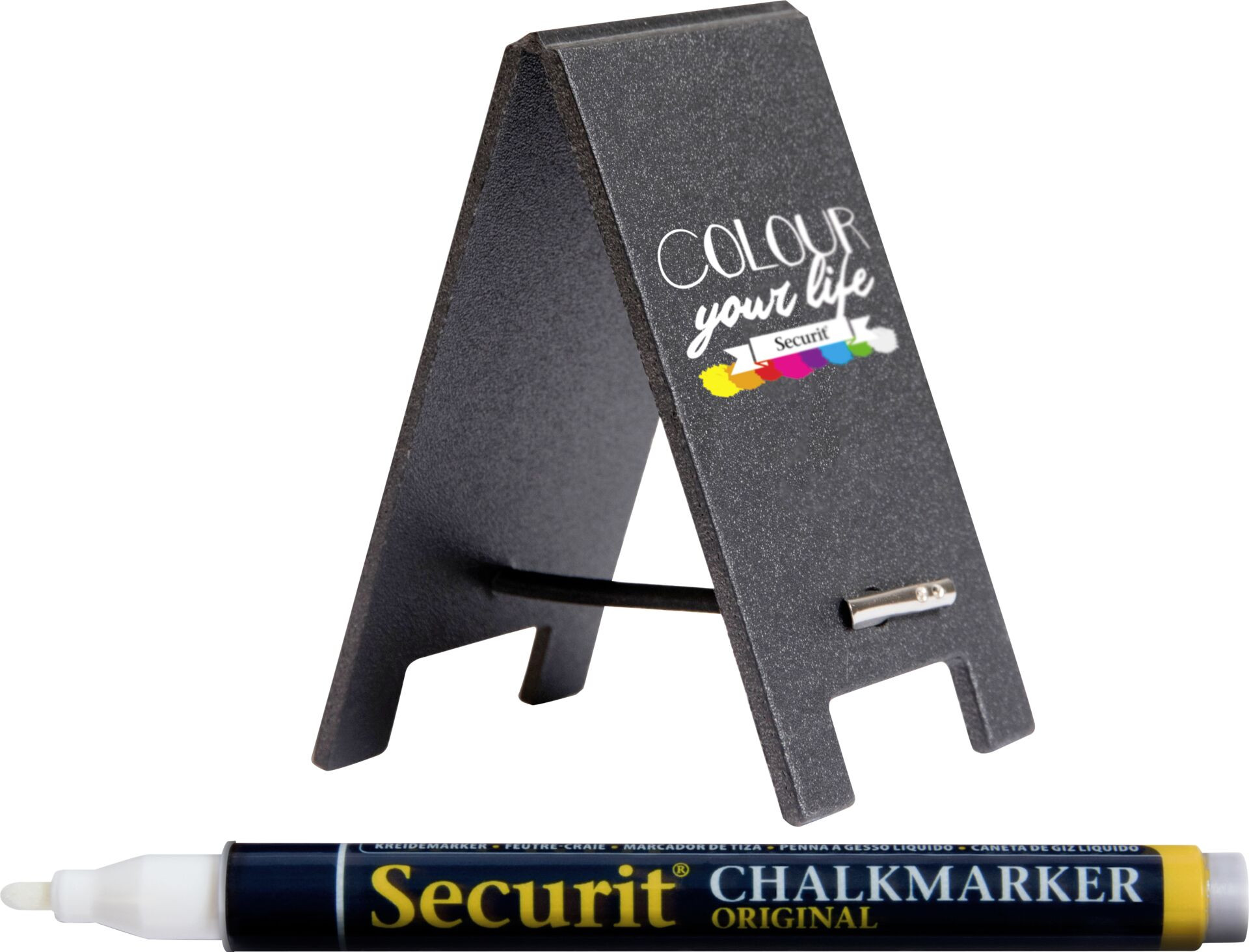 Set besteht aus 5 Tafeln in schwarz, 1 Kreidemarker weiß, Stärke 1-2mm und 5 Gummis zum Befestigen der beiden Seiten. Beschriftung auch mit anderen Kreidemarkern aus unserem Katalog möglich.